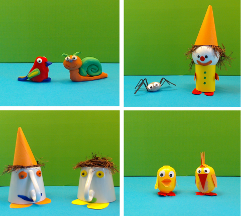 Eine ganz eigene Ästhetik bekommt man natürlich, wenn die Figuren selber gestaltet werden. Für einen einfachen Einstieg bietet sich dazu Knetmasse an. Achtung! Es gibt hier unterschiedliche Produkte. Man sollte den Umgang damit ausprobieren. Knetmasse mit einem hohen Fettanteil, die bei Wärme sehr weich wird oder verschmiert, eignet sich weniger (geeignet ist z.B. Waible Knet oder Lupus). Knetmasse hinterlässt auf saugenden Untergründen unschöne Flecken, auch das sollte beachtet werden. Idealerweise passt man die Gestaltung der Figuren dem Material an. Knetfiguren sollten beispielsweise kompakt sein, sonst sind sie instabil und brauchen evtl. sogar ein Innengerüst aus Draht. Auch aus Pappe (z.B. Papprollen), Korken, Schaumstoff, Draht, Alufolie, Servietten etc. lassen sich 3D-Figuren gestalten.